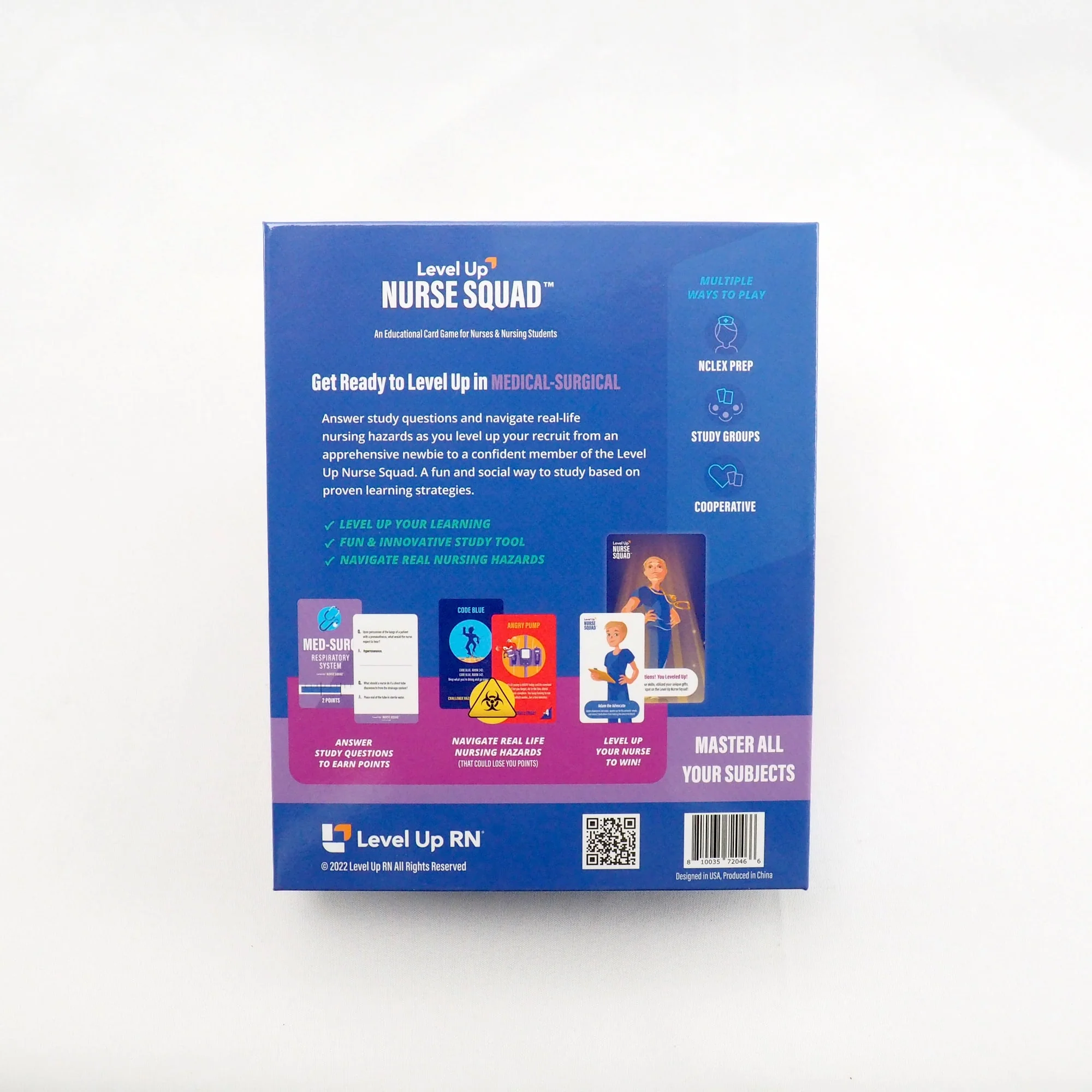 A perfect complement to Level Up RN's flashcards, this game takes the concepts you've studied and puts them in a study format that's perfect for solo study or group play with up to 8 players.